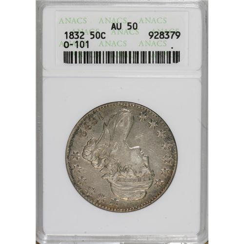 <B>1832 50C Small Letters AU50 ANACS.</B></I> O-101. NGC Census: (192/2022). PCGS Population (131/738). Mintage: 4,797,000. Numismedia Wsl. Price for NGC/PCGS coin in AU50: $233. (#6160)<BR><BR><b>Shipping:</b> Coins & Currency (<a target="_blank" href="http://www.heritageauctions.com/common/shipping.php">view shipping information</a>)