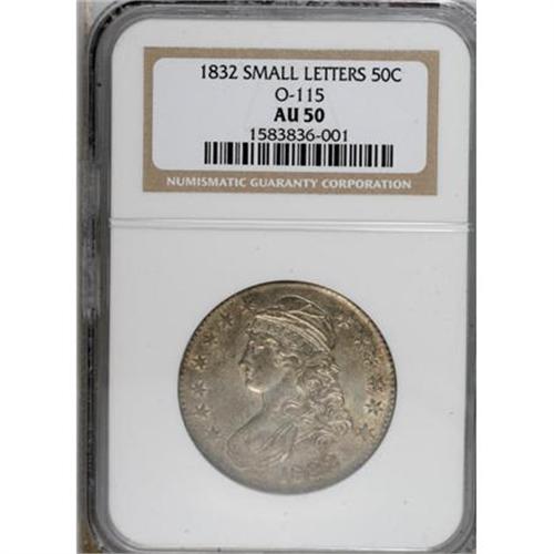 <B>1832 50C Small Letters AU50 NGC.</B></I> O-115. NGC Census: (100/1041). PCGS Population (138/778). Mintage: 4,797,000. Numismedia Wsl. Price for NGC/PCGS coin in AU50: $233. (#6160)<BR><BR><B>Coin Engraver:</B> John Reich<BR><BR><b>Shipping:</b> Coins & Currency (<a target="_blank" href="http://www.heritageauctions.com/common/shipping.php">view shipping information</a>)