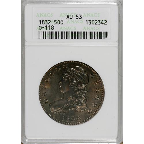 <B>1832 50C Small Letters AU53 ANACS.</B></I> O-118. NGC Census: (184/1838). PCGS Population (96/642). Mintage: 4,797,000. Numismedia Wsl. Price for NGC/PCGS coin in AU53: $260. (#6160)<BR><BR><b>Shipping:</b> Coins & Currency (<a target="_blank" href="http://www.heritageauctions.com/common/shipping.php">view shipping information</a>)