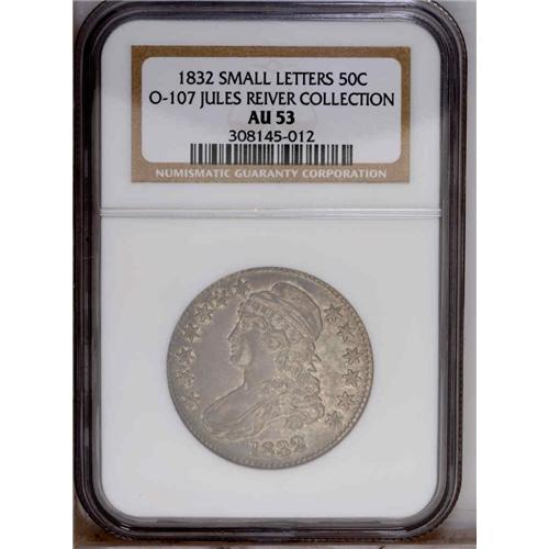 <B>1832<50C> Small Letters AU53 NGC.</B></I> O-107, R.2. Attributed by the high 2 in the date, and a long vertical die defect line that extends from the upper right corner of the shield. The coin offered in this lot displays luster in the protected areas, and light gray toning. The surface are quite clean.<BR><I>Ex: Steve Levy (2/26/1979).</B></I> Envelope Included.