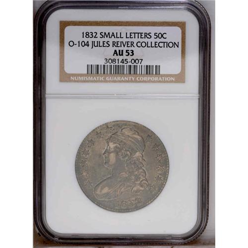 <B>1832<50C> Small Letters AU53 NGC.</B></I> O-104, R.3.A die defect prong extends down from the tip of the left (right facing) wing, and the arrowheads are malformed and solidly joined. Medium gray-mauve and blue patina runs over each side, and traces of luster are seen in the recessed areas.<BR><I>Ex: Stack's (6/18/1987).</B></I> Envelope Included.