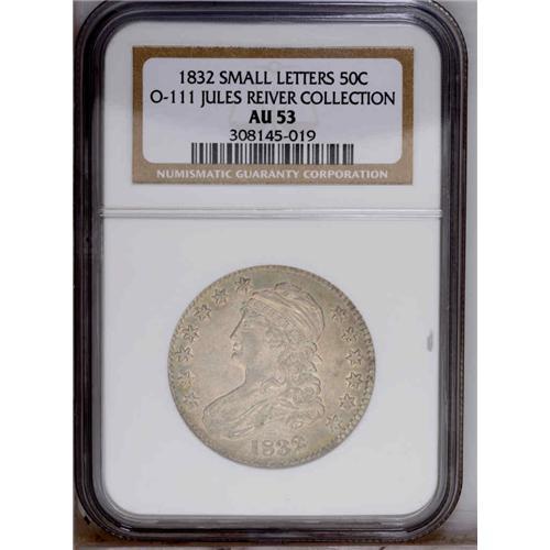 <B>1832<50C> Small Letters AU53 NGC.</B></I> O-111, R.1. The date is relatively high, and the mouth of Liberty, according to Overton, seems to have a crying expression. Light gray patination is imbued with light blue accents, and luster is apparent in the recessed areas.<BR><I>Ex: Fidelity (5/5/1989).</B></I> Envelope Included.