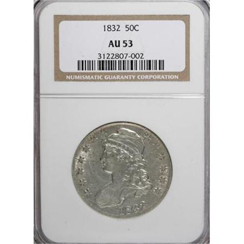 <B>1832 50C Small Letters AU53 NGC.</B></I> NGC Census: (105/973). PCGS Population (110/720). Mintage: 4,797,000. Numismedia Wsl. Price for NGC/PCGS coin in AU53: $350. (#6160)<BR><BR><B>Coin Engraver:</B> John Reich<BR><BR><b>Shipping:</b> Coins & Currency (<a target="_blank" href="http://www.heritageauctions.com/common/shipping.php">view shipping information</a>)