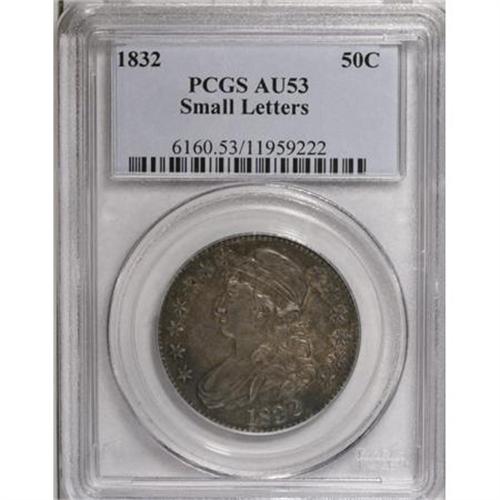 <B>1832 50C Small Letters AU53 PCGS.</B></I> . PCGS Population (108/708). NGC Census: (104/962). Mintage: 4,797,000. Numismedia Wsl. Price for NGC/PCGS coin in AU53: $350. (#6160)<BR><BR><B>Coin Engraver:</B> John Reich<BR><BR><b>Shipping:</b> Coins & Currency (<a target="_blank" href="http://www.heritageauctions.com/common/shipping.php">view shipping information</a>)