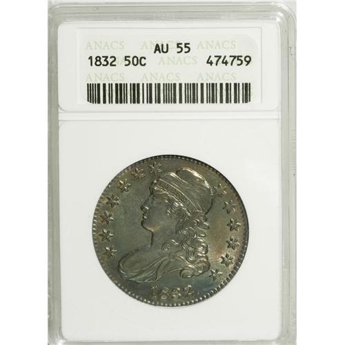 <B>1832 50C Small Letters AU55 ANACS.</B></I> NGC Census: (187/725). PCGS Population (179/462). Mintage: 4,797,000. Numismedia Wsl. Price: $275. (#6160)<BR><BR><b>Shipping:</b> Coins & Currency (<a target="_blank" href="http://www.heritageauctions.com/common/shipping.php">view shipping information</a>)