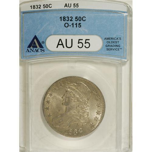 <B>1832 50C Small Letters AU55 ANACS.</B></I> O-115. NGC Census: (187/732). PCGS Population (181/461). Mintage: 4,797,000. Numismedia Wsl. Price for NGC/PCGS coin in AU55: $275. (#6160)<BR><BR><b>Shipping:</b> Coins & Currency (<a target="_blank" href="http://www.heritageauctions.com/common/shipping.php">view shipping information</a>)
