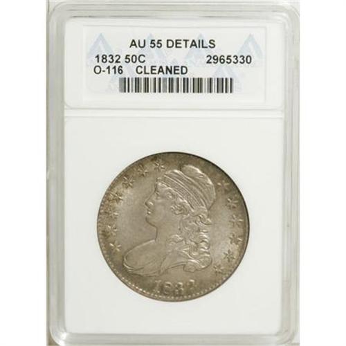 <B>1832 50C Small Letters--Cleaned--ANACS. AU55 Details.</B></I> O-116. NGC Census: (187/732). PCGS Population (181/461). Mintage: 4,797,000. Numismedia Wsl. Price for NGC/PCGS coin in AU55: $275. (#6160)<BR><BR><B>Coin Engraver:</B> John Reich<BR><BR><b>Shipping:</b> Coins & Currency (<a target="_blank" href="http://www.heritageauctions.com/common/shipping.php">view shipping information</a>)