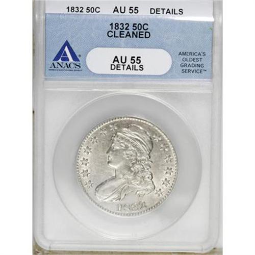 <B>1832 50C Small Letters--Cleaned--ANACS. AU55 Details.</B></I> NGC Census: (193/760). PCGS Population (202/482). Mintage: 4,797,000. Numismedia Wsl. Price for NGC/PCGS coin in AU55: $300. (#6160)<BR><BR><B>Coin Engraver:</B> John Reich<BR><BR><b>Shipping:</b> Coins & Currency (<a target="_blank" href="http://www.heritageauctions.com/common/shipping.php">view shipping information</a>)