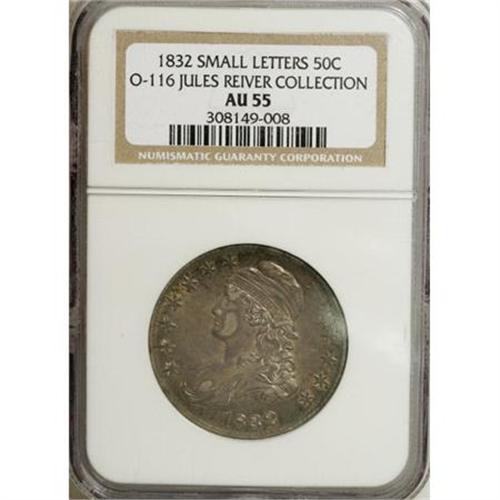 <B>1832 50C Small Letters AU55 NGC.</B></I> O-116. Ex: Jules Reiver Collection. NGC Census: (190/736). PCGS Population (179/461). Mintage: 4,797,000. Numismedia Wsl. Price for NGC/PCGS coin in AU55: $300. (#6160)<BR><BR><b>Shipping:</b> Coins & Currency (<a target="_blank" href="http://www.heritageauctions.com/common/shipping.php">view shipping information</a>)