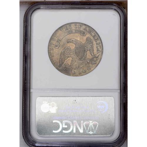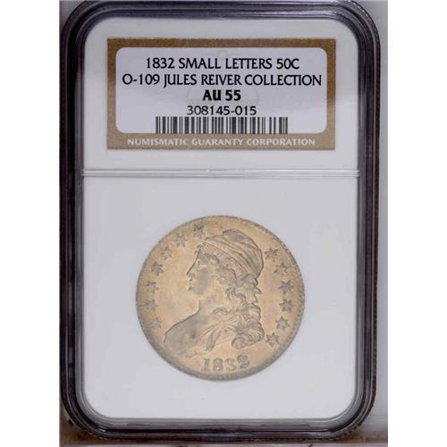 <B>1832<50C> Small Letters AU55 NGC.</B></I> O-109, R.4. The 3 in the date is low, and there is a die defect line between the eagle's neck and left (right facing) wing. Silvery surfaces retain considerable luster. Envelope Included.