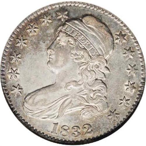<B>1832<50C> Small Letters AU55 NGC.</B></I> O-112, R.2. The well-known "Dash Date" is not one of the rarer varieties of the year, but it is one of the more collectible ones and it is moderately difficult to locate in high grades. This is a bright, lustrous coin that shows a significant overlay of golden-brown and light gray patina. A bit softly struck over the highpoints.<BR><I>Ex: Don Frederick (1/10/1981).</B></I> Envelope Included.