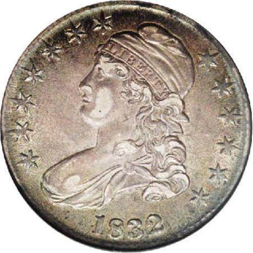 <B>1832<50C> Small Letters AU55 NGC.</B></I> O-116, R.3. First use of this obverse, the 1 over 1 feature in the date is at first subtle, but when seen is actually quite obvious. This is another reverse in this long series that shows malformed arrowheads on the reverse--hardly distinctive by themselves; however, the A in STATES is significantly higher than the first T. The deep gray-golden surfaces are accented by much lighter highpoints on each side.<BR><I>Ex: Snyder (3/18/1980).</B></I> Envelope Included.