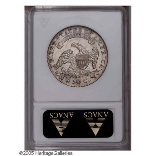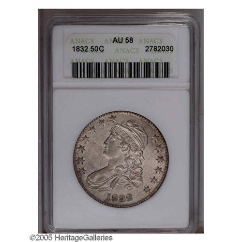 <B>1832<50C> Small Letters AU58 ANACS.</B></I> O-111, R.1. Bright frosty surfaces are essentially untoned, and exhibit sharply struck design elements, though most of the star centers are weak. The devices are well centered on the planchet, and a few light contact marks are seen on the upper reverse, above the eagle's head. Traces of highpoint wear explain the AU grade assessment.