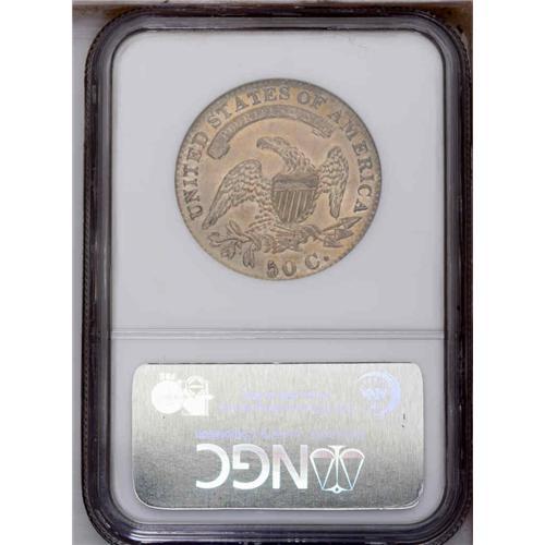 <B>1832<50C> Small Letters AU58 NGC.</B></I> O-102, R.1.The malformed and solidly joined arrowheads, and the die defect at the tip of the left (right facing) wing identify the variety. Well preserved, golden-gray surfaces display ample luster.<BR><I>Ex: Lawver (12/14/1984).</B></I> Envelope Included.