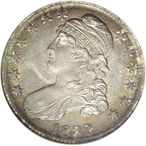 <B>1832<50C> Small Letters AU58 NGC.</B></I> O-113a, R.4. The obverse of O-113 is recognized by a tiny die chip at Miss Liberty's throat, exactly at the junction of her neck and jaw line. This later die state is devoid of milling and shows the stars and some of the letters drawn the edge. Gold and bluish-gray patination adheres to each side. Minor weakness is noted in most of the star centers, and the upper horizontal lines are coalesced. A few minute marks on Liberty's cheek and neck do not distract. Envelope Included.