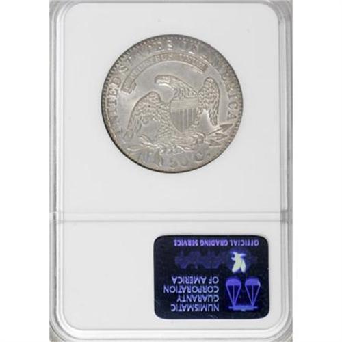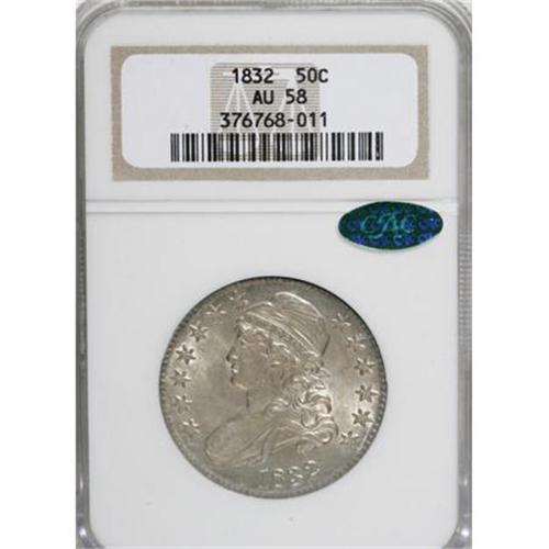 <B>1832 50C Small Letters AU58 NGC.</B></I> O-122, R.1. This lustrous representative has delicate apricot toning and only a whisper of highpoint friction. The only remotely mentionable mark is beneath the left (facing) wing.<BR><I>From The Southwest Collection.</B></I><BR><BR><B>Coin Engraver:</B> John Reich<BR><BR><b>Shipping:</b> Coins & Currency (<a target="_blank" href="http://www.heritageauctions.com/common/shipping.php">view shipping information</a>)