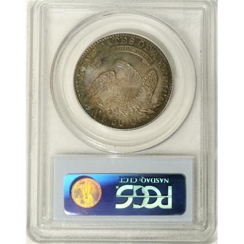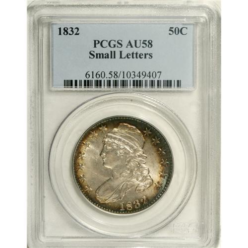 <B>1832 50C Small Letters AU58 PCGS.</B></I> O-118, R.1.Considerable luster is retained on both sides, and cobalt-blue, lavender, and golden-brown toning rings the obverse peripheries, and is evenly distributed over the reverse. Generally well struck, with no mentionable marks.<BR><BR><b>Shipping:</b> Coins & Currency (<a target="_blank" href="http://www.heritageauctions.com/common/shipping.php">view shipping information</a>)