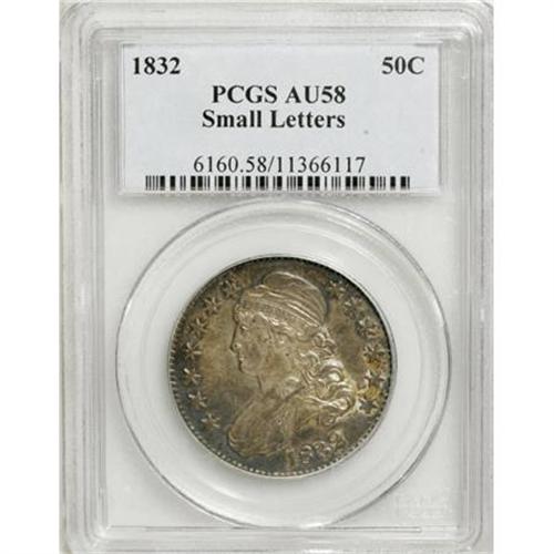 <B>1832 50C Small Letters AU58 PCGS.</B></I> PCGS Population (200/287). NGC Census: (369/392). Mintage: 4,797,000. Numismedia Wsl. Price for NGC/PCGS coin in AU58: $585. (#6160)<BR><BR><B>Coin Engraver:</B> John Reich<BR><BR><b>Shipping:</b> Coins & Currency (<a target="_blank" href="http://www.heritageauctions.com/common/shipping.php">view shipping information</a>)
