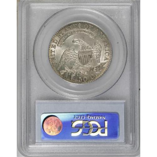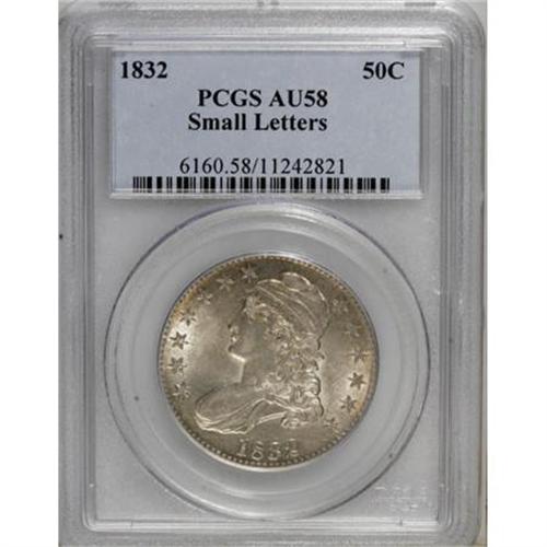 <B>1832 50C Small Letters AU58 PCGS.</B></I> O-116, R.3. The 1 in the date was first punched with a long serif, then with a short, blunt 1, evident on the serif, the base, and the right upright of the digit. On the reverse the arrowheads are poorly formed, and the A in STATES is higher than the first T. This splendid near-Mint piece has lots of silvery luster and eye appeal, with glints of gold and pink. <BR><BR><B>Coin Engraver:</B> John Reich<BR><BR><b>Shipping:</b> Coins & Currency (<a target="_blank" href="http://www.heritageauctions.com/common/shipping.php">view shipping information</a>)