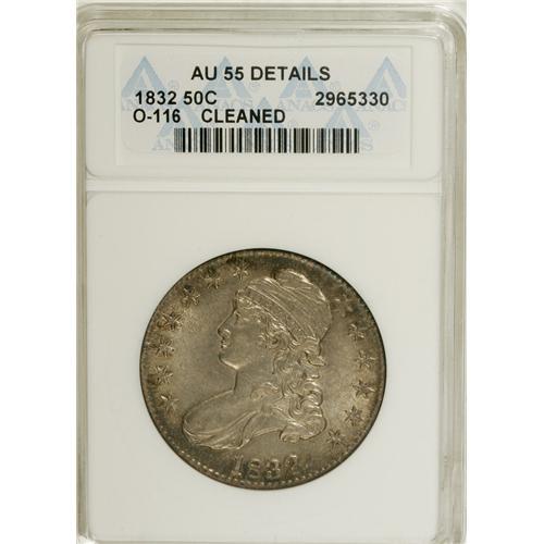 <B>1832 50C Small Letters--Cleaned--ANACS. AU55 Details.</B></I> O-116. NGC Census: (187/732). PCGS Population (181/461). Mintage: 4,797,000. Numismedia Wsl. Price for NGC/PCGS coin in AU55: $275. (#6160)<BR><BR><b>Shipping:</b> Coins & Currency (<a target="_blank" href="http://www.heritageauctions.com/common/shipping.php">view shipping information</a>)