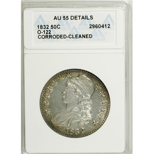 <B>1832 50C Small Letters--Cleaned, Corroded--ANACS. AU55 Details.</B></I> O-122. NGC Census: (187/728). PCGS Population (179/462). Mintage: 4,797,000. Numismedia Wsl. Price: $275. (#6160)<BR><BR><b>Shipping:</b> Coins & Currency (<a target="_blank" href="http://www.heritageauctions.com/common/shipping.php">view shipping information</a>)