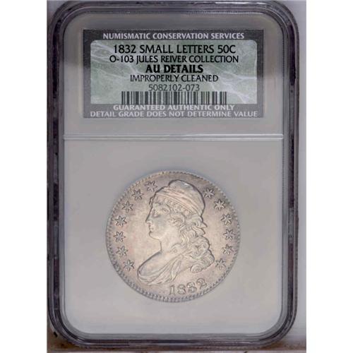 <B>1832<50C> Small Letters--Improperly Cleaned--NCC. AU Details.</B></I> O-103, R.1. Attributed by the die lump on the drapery fold between the 1 and the 8 in the date, and the recut 5 at the left upright of 50. Bright silvery-mauve surfaces reveal some wispy hairlines, and decent amounts of residual luster. A very decent coin, despite the light cleaning.<BR><I>Ex: Portland ANA (8/10/1998).</B></I> Envelope Included.