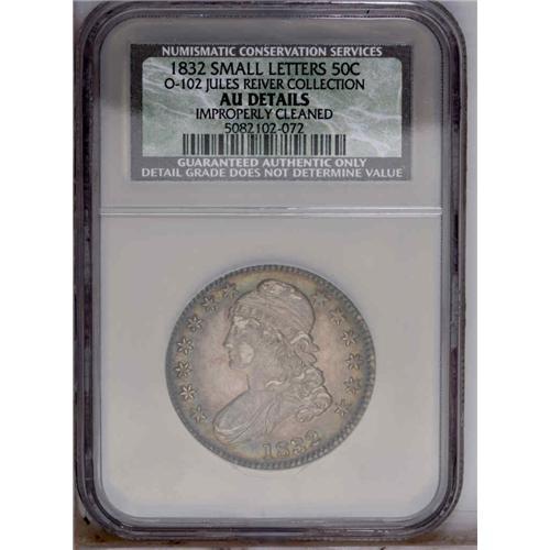 <B>1832<50C> Small Letters--Improperly Cleaned--NCS. AU Details.</B></I> O-102, R.1.The malformed and solidly joined arrowheads, and the die defect at the tip of the left (right facing) wing identify the variety. Wispy hairlines are noted on the grayish-mauve surfaces that display light blue accents. Envelope Included.