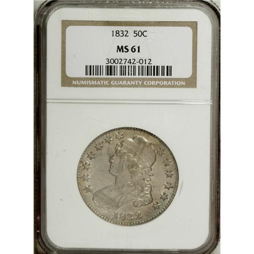 <B>1832 50C Small Letters MS61 NGC.</B></I> O-102, R.1. The so-called "Laced Lips" variety with Small Letters reverse. A well struck example, lustrous beneath delicate peach and blue toning. The reverse shows evidence of die erosion, though this has not progressed to the point visible on O-102a examples.<BR><BR><b>Shipping:</b> Coin/Currency (<a target="_blank" href="http://www.heritageauctions.com/common/shipping.php">view shipping information</a>)