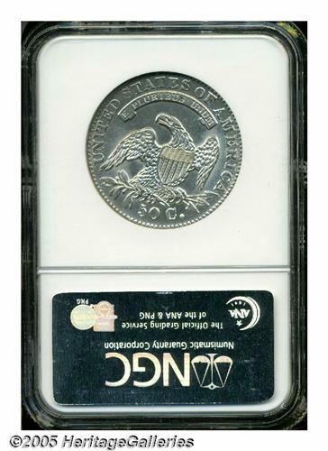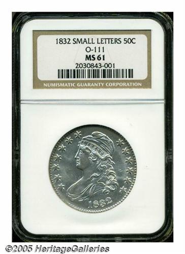 <B>1832<50C> Small Letters MS61 NGC.</B></I> O-111, R.1. Bright frosty surfaces are essentially untoned, and exhibit sharply struck design elements, though the star centers are weak. The devices are well centered on the planchet, and a few light contact marks are seen on Liberty's cheek and neck, and in the right (facing) obverse field.