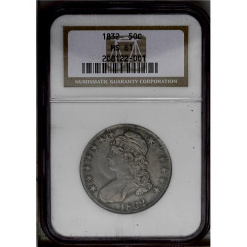 <B>1832<50C> Small Letters MS61 NGC.</B></I> O-113a, R.4. The scarce late die state with dramatic flow lines in the fields near the borders. This satiny dove-gray is remarkably smooth for the grade, but the stars and much of PLURIBUS is indifferently struck. Liberty's nose and chin are doubled. <BR><BR><B>Important notice:</B> Heritage usually auctions material at the rate of 200-250 lots per hour. On some occasions eBay Live bid software or the Internet may not be able to keep up with the pace of the auction. We recommend placing a realistic absentee bid now as insurance to avoid disappointment. Occasionally the auctioneer may eliminate or reject an eBay Live bid, and the auctioneer may also reopen a lot after the close of the eBay live bidding (usually because we missed an audience bid), and may reject your bid even if it shows you as the winning bidder. By bidding via eBay Live, you agree that Heritage may award the lot to another bidder at its sole discretion under the circumstances described above or any other reasonable circumstances. Since eBay bids are not shown to us until we open the lot on the floor, we treat those bids just like floor bids. In most cases the floor responds before the eBay bid is presented to us, due to Internet lag time, so for consistency we have made it a policy that floor bids are always considered first over tie eBay live bids. Also please note that all Heritage lots purchased through eBay Live carry a 20% Buyer's Premium. Please make sure you read the Terms and Conditions before you bid. This lot is being auctioned in conjunction with a live floor auction by Heritage Galleries & Auctioneers. All final auction and invoice information will be supplied by Heritage Galleries & Auctioneers, and all other information should be considered preliminary. Lot:1966 <BR><BR><B>Winning Notification and Billing:</B> After the FINAL session in this auction is complete, Heritage will send e-mail and snail mail invoices. This process normally takes several days. All final auction and invoice information will be supplied by Heritage Galleries & Auctioneers, and all other information should be considered preliminary. <BR><BR>This auction will be conducted on a live auction floor and over the Internet through eBay Live. If you choose to place an absentee bid, please take a moment to <font color='#0000ff'><u><a href='http://pages.ebay.com/liveauctions/help/before/laabsentee.html'>learn how eBay Live absentee bidding works</a></u></font><font color='#000000'>