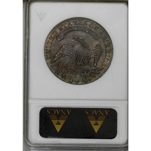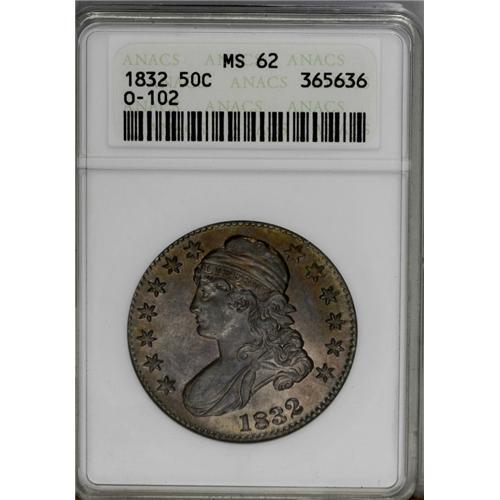 <B>1832 50C Small Letters MS62 ANACS.</B></I> O-102a, R.3. The eagle's tail feathers are largely lapped away on this late die state. Lavender, gold, and olive toning invigorates this lustrous representative. Crisply brought up save for the upper stars and the right (facing) claws.<BR><I>From The Jones Beach Collection.</B></I><BR><BR><b>Shipping:</b> Coin/Currency (<a target="_blank" href="http://www.heritageauctions.com/common/shipping.php">view shipping information</a>)