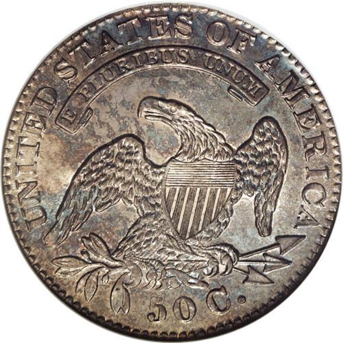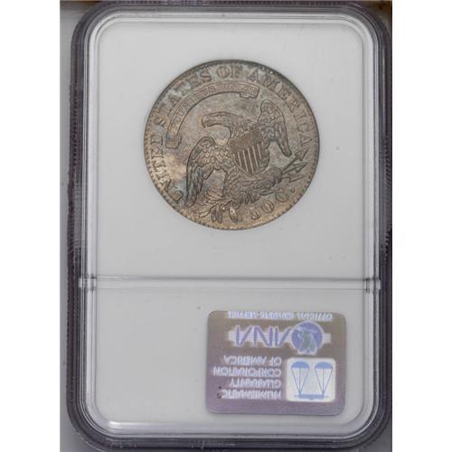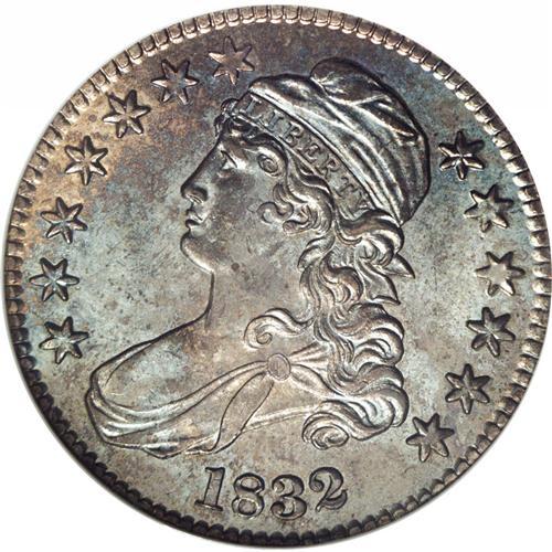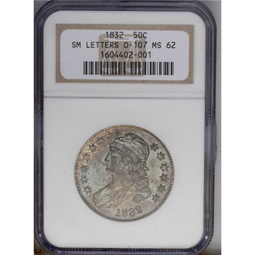 <B>1832 50C Small Letters MS62 NGC.</B></I> O-107, R.2. Ice-blue and peach tints envelop this glossy and unmolested piece. Some of the stars lack full centers, but the strike is generally sharp, and the charm is irrefutable. The single finest among 10 examples certified by NGC as O-107; the next highest graded is AU58.<BR><I>From The Westmoreland, Virginia Collection.</B></I>
