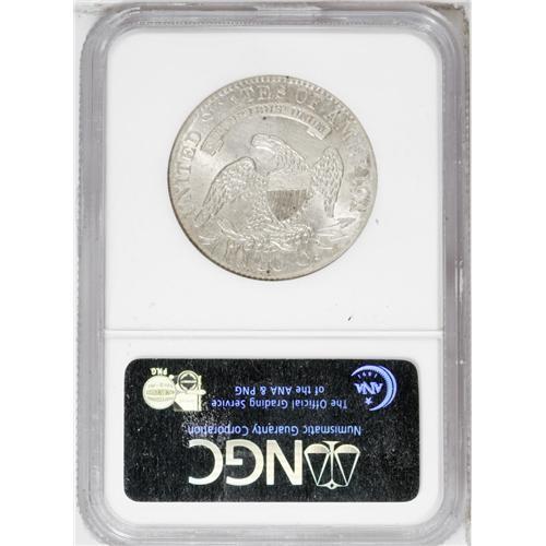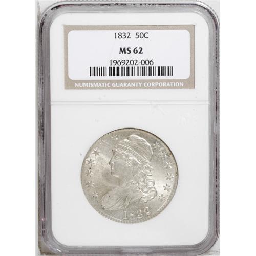 <B>1832<50C> Small Letters MS62 NGC.</B></I> O-118, R.1. Creamy luster rolls across the lightly toned surfaces. Well struck in the centers, while the borders are blurry and drawn to the rim due to a later die state. A couple of tiny contact marks on each side, but otherwise well preserved.