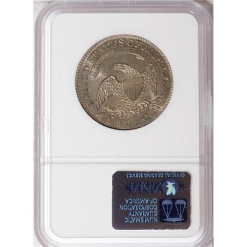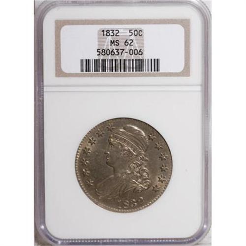 <B>1832 50C Small Letters MS62 NGC.</B></I> O-103, R.1. Star 8 is close to the cap, and a small die lump appears on the drapery fold between the 18 and the clasp. On the reverse the 5 in the denomination is recut on its left upright. This piece boasts moderately lustrous gray-gold surfaces that appear high-end for the assigned grade.<B><BR></B></I><I>From The Arnold & Harriet Collection.</B></I><BR><BR><B>Coin Engraver:</B> John Reich<BR><BR><b>Shipping:</b> Coins & Currency (<a target="_blank" href="http://www.heritageauctions.com/common/shipping.php">view shipping information</a>)