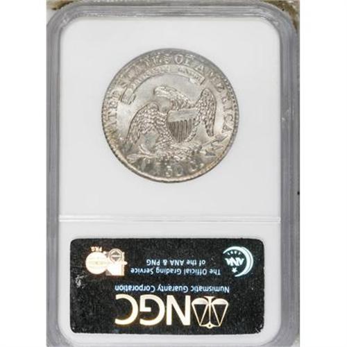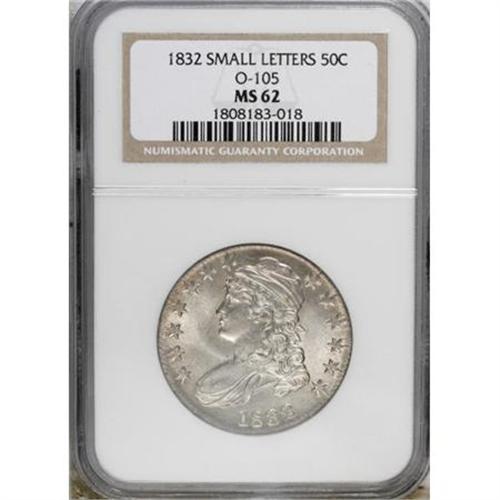 <B>1832 50C Small Letters MS62 NGC.</B></I> O-105, R.3. Light tan toning graces the borders of this lustrous and impressively mark-free representative. The major devices are well struck, although the stars are mostly flat.<BR><BR><B>Coin Engraver:</B> John Reich<BR><BR><b>Shipping:</b> Coins & Currency (<a target="_blank" href="http://www.heritageauctions.com/common/shipping.php">view shipping information</a>)