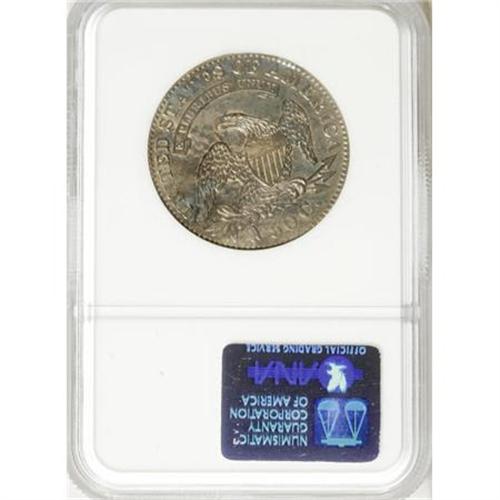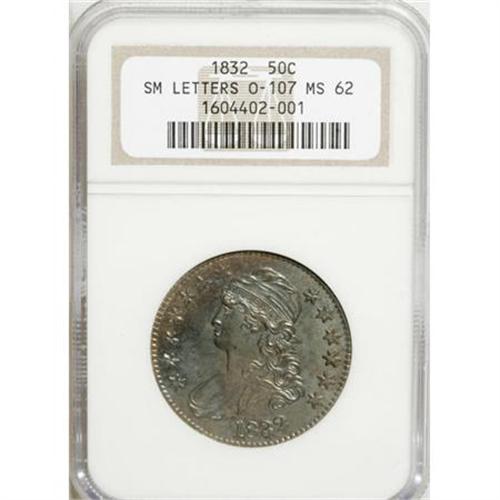 <B>1832 50C Small Letters MS62 NGC.</B></I> O-107, R.2. Ice-blue and peach tints envelop this glossy and unmolested piece. Some of the stars lack full centers, but the strike is generally sharp, and the charm is irrefutable. The single finest among 11 examples certified by NGC as O-107; the next highest graded is AU58 (11/07).<BR><BR><B>Coin Engraver:</B> John Reich<BR><BR><b>Shipping:</b> Coins & Currency (<a target="_blank" href="http://www.heritageauctions.com/common/shipping.php">view shipping information</a>)