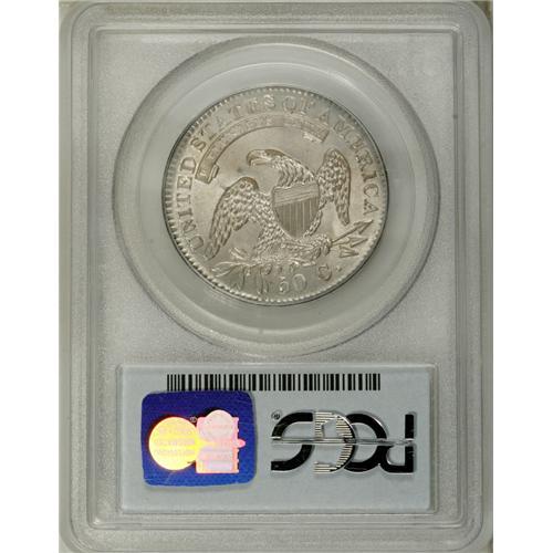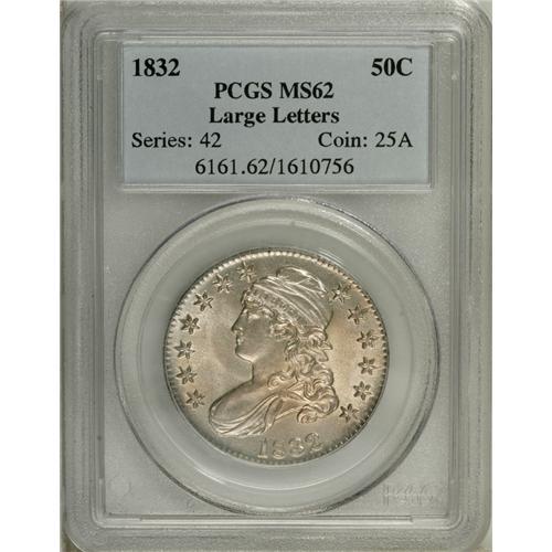 <B>1832 50C Small Letters MS62 PCGS.</B></I> O-103, R.1. The PCGS holder incorrectly designates the variety as Large Letters. The luster is exceptional and the eye appeal is that of a much higher grade. Close inspection with a loupe reveals several light, wispy marks easily missed by the casual viewer.<BR><BR><b>Shipping:</b> Coin/Currency (<a target="_blank" href="http://www.heritageauctions.com/common/shipping.php">view shipping information</a>)