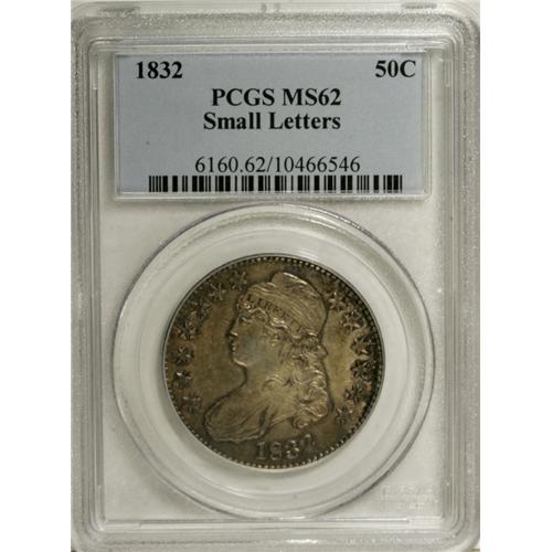 <B>1832 50C Small Letters MS62 PCGS.</B></I> O-107, R.2. A chestnut-brown and pearl-gray piece with subtle satin luster and a good strike. Thorough examination beneath a loupe cannot locate any relevant marks.<BR><BR><b>Shipping:</b> Coins & Currency (<a target="_blank" href="http://www.heritageauctions.com/common/shipping.php">view shipping information</a>)