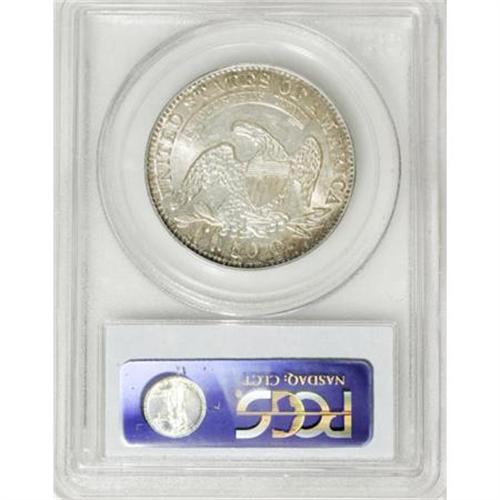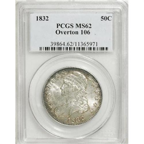 <B>1832 50C Small Letters MS62 PCGS.</B></I> O-106, R.1. Splashes of honey-gold and forest-green grace the peripheries, while the remainder of this lustrous half is silver-white. Sharply struck, and unmarked except for a cluster of faint abrasions above the eagle's neck.<BR><BR><B>Coin Engraver:</B> John Reich<BR><BR><b>Shipping:</b> Coins & Currency (<a target="_blank" href="http://www.heritageauctions.com/common/shipping.php">view shipping information</a>)