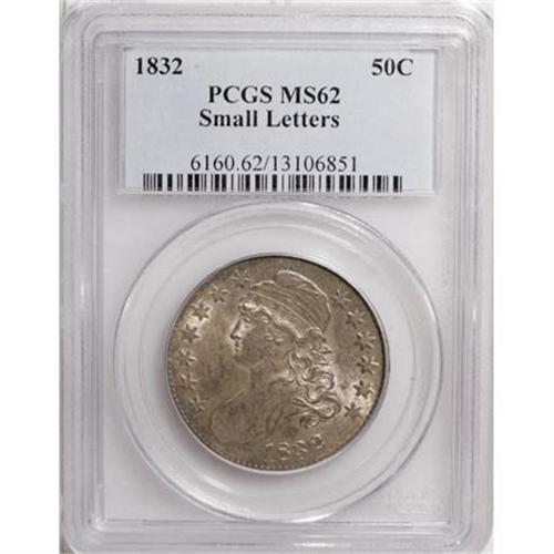 <B>1832 50C Small Letters MS62 PCGS.</B></I> O-110, R.1. The small tine that protrudes from the top of Liberty's cap is the most obvious die marker, while the softness at the A of STATES on the reverse is typical for the variety. Nicely struck otherwise with soft luster beneath delicate steel-gray and gold patina that graces each side.<BR><BR><B>Coin Engraver:</B> John Reich<BR><BR><b>Shipping:</b> Coins & Currency (<a target="_blank" href="http://www.heritageauctions.com/common/shipping.php">view shipping information</a>)