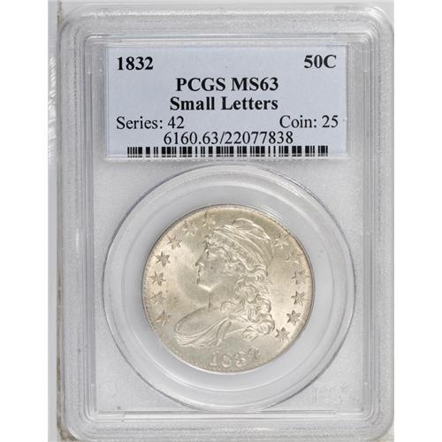 <B>1832 50C Small Letters MS63 PCGS.</B></I> O-105, R.3. A sharp strike is enhanced by frosty silver luster and hints of champagne toning on each side. This example is exceptional for its quality, ranking among the top examples of the variety.<BR><I>From The Park Cities Collection.</B></I><BR><BR><b>Shipping:</b> Coin/Currency (<a target="_blank" href="http://www.heritageauctions.com/common/shipping.php">view shipping information</a>)