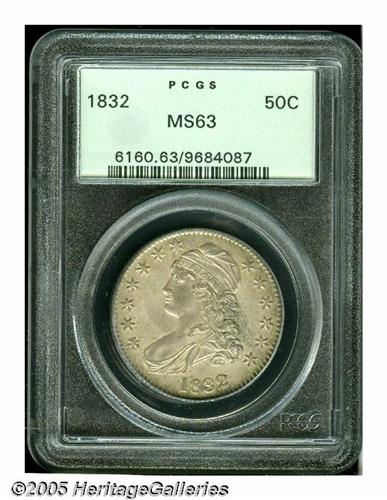 <B>1832<50C> Small Letters MS63 PCGS.</B></I> O-118, R.1. A beautiful older holder type coin, originally toned in rich cream-gray colors. Undisturbed, and with eye appeal beyond the numerical grade.<BR><I>From the Dr. Kurt Peters Collection.</B></I> From the Dr. Kurt Peters Collection.