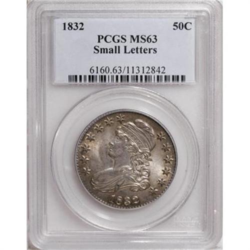 <B>1832 50C Small Letters MS63 PCGS.</B></I> O-103, R.1. Golden-brown and lilac toning embrace this lustrous and evenly struck Capped Bust type coin. Careful examination fails to locate mentionable marks. Desirable in such exemplary condition.<BR><BR><B>Coin Engraver:</B> John Reich<BR><BR><b>Shipping:</b> Coins & Currency (<a target="_blank" href="http://www.heritageauctions.com/common/shipping.php">view shipping information</a>)