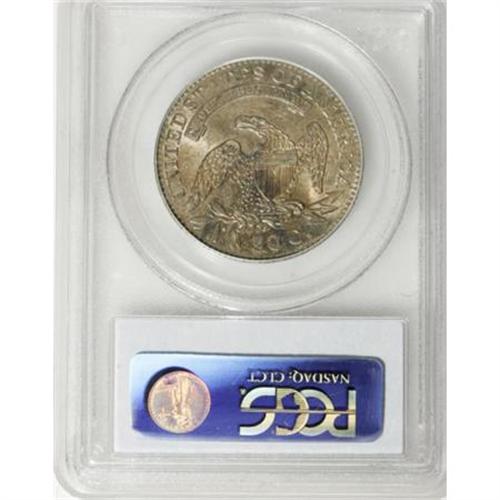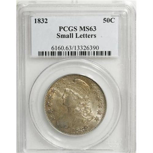 <B>1832 50C Small Letters MS63 PCGS.</B></I> O-110, R.1. The "Spiked Cap" variety, named for the short die line near the summit of Liberty's cap. Lovely peach-gold, lilac, and steel-blue adorn this lustrous and unblemished Select bust half. The strike is slightly soft on the UR in PLURIBUS, as usual for the die marriage.<BR><BR><B>Coin Engraver:</B> John Reich<BR><BR><b>Shipping:</b> Coins & Currency (<a target="_blank" href="http://www.heritageauctions.com/common/shipping.php">view shipping information</a>)