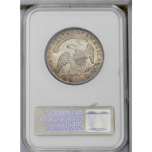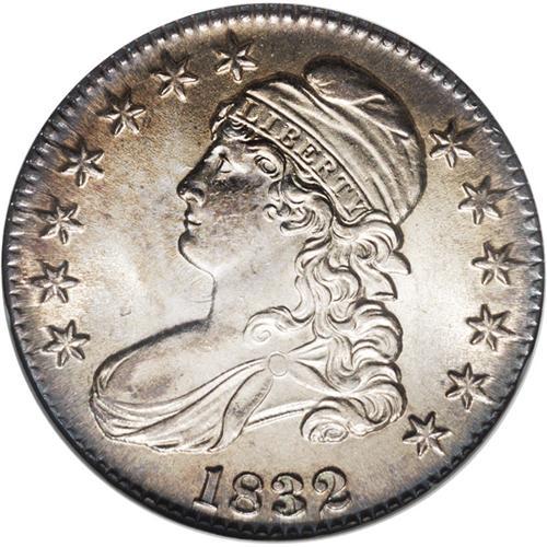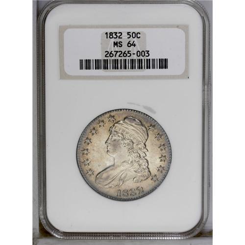 <B>1832<50C> Small Letters MS64 NGC.</B></I> O-103, R.1. Most easily attributed by the die lump on Liberty's drapery fold and the recutting on the upright of the 5 in the denomination. Both sides exhibit bright, shimmering luster and bits of golden and blue peripheral toning. <BR><BR><B>Important notice:</B> Heritage usually auctions material at the rate of 200-250 lots per hour. On some occasions eBay Live bid software or the Internet may not be able to keep up with the pace of the auction. We recommend placing a realistic absentee bid now as insurance to avoid disappointment. Occasionally the auctioneer may eliminate or reject an eBay Live bid, and the auctioneer may also reopen a lot after the close of the eBay live bidding (usually because we missed an audience bid), and may reject your bid even if it shows you as the winning bidder. By bidding via eBay Live, you agree that Heritage may award the lot to another bidder at its sole discretion under the circumstances described above or any other reasonable circumstances. Since eBay bids are not shown to us until we open the lot on the floor, we treat those bids just like floor bids. In most cases the floor responds before the eBay bid is presented to us, due to Internet lag time, so for consistency we have made it a policy that floor bids are always considered first over tie eBay live bids. Also please note that all Heritage lots purchased through eBay Live carry a 20% Buyer's Premium. Please make sure you read the Terms and Conditions before you bid. This lot is being auctioned in conjunction with a live floor auction by Heritage Galleries & Auctioneers. All final auction and invoice information will be supplied by Heritage Galleries & Auctioneers, and all other information should be considered preliminary. Lot:1968 <BR><BR><B>Winning Notification and Billing:</B> After the FINAL session in this auction is complete, Heritage will send e-mail and snail mail invoices. This process normally takes several days. All final auction and invoice information will be supplied by Heritage Galleries & Auctioneers, and all other information should be considered preliminary. <BR><BR>This auction will be conducted on a live auction floor and over the Internet through eBay Live. If you choose to place an absentee bid, please take a moment to <font color='#0000ff'><u><a href='http://pages.ebay.com/liveauctions/help/before/laabsentee.html'>learn how eBay Live absentee bidding works</a></u></font><font color='#000000'>