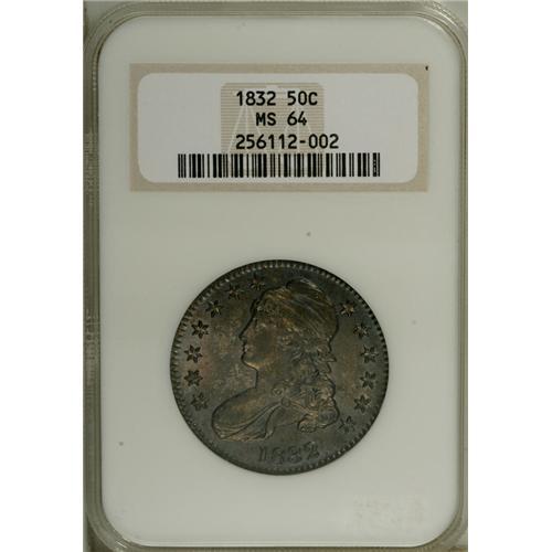 <B>1832 50C Small Letters MS64 NGC.</B></I> O-106, R.1. Star 1 is sharply recut on this obverse. While a few Gem examples of this die marriage are known, the present near-Gem specimen is among the finer pieces certified. Weakness is evident on the highest points of the design as often seen. Both sides have smooth satiny surfaces with excellent luster beneath deep gold, rose, and steel toning.<BR><I>From The Westmoreland, Virginia Collection, Part Two.</B></I><BR><BR><b>Shipping:</b> Coin/Currency (<a target="_blank" href="http://www.heritageauctions.com/common/shipping.php">view shipping information</a>)