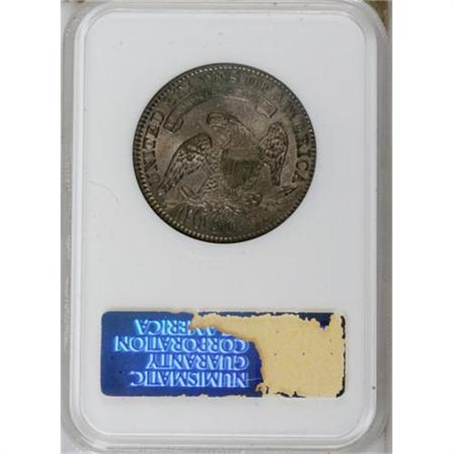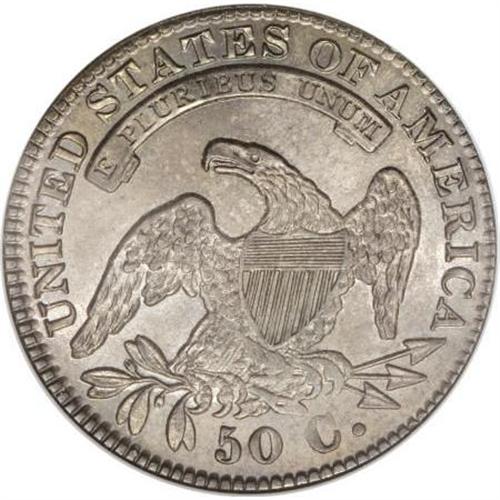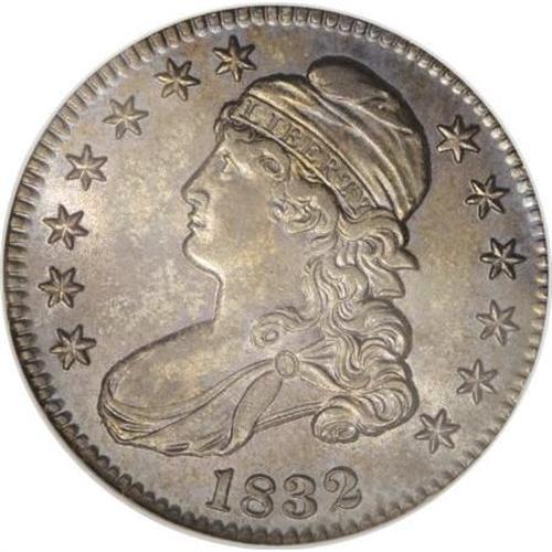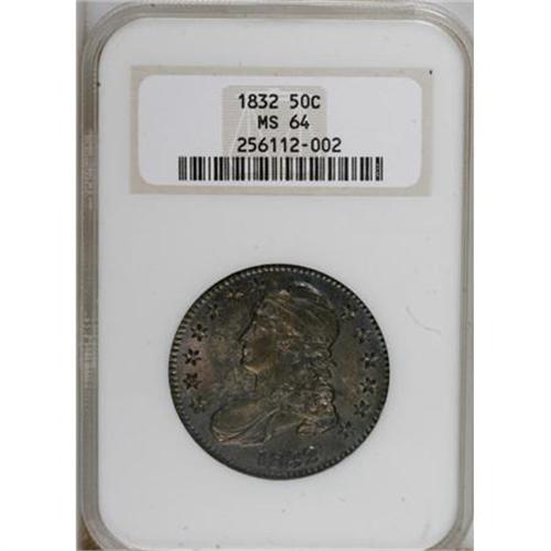 <B>1832 50C Small Letters MS64 NGC.</B></I> O-106, R.1. The first star is broadly recut for this collectible Overton variety. Olive-gray toning drapes this lustrous and unblemished half dollar. The stars, denticles, and PLURIBUS are decisively struck, while the forehead curls and the right (facing) claw show minor bluntness. Encapsulated in a prior generation holder.<BR><BR><B>Coin Engraver:</B> John Reich<BR><BR><b>Shipping:</b> Coins & Currency (<a target="_blank" href="http://www.heritageauctions.com/common/shipping.php">view shipping information</a>)