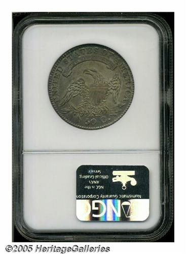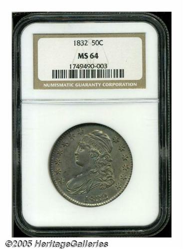<B>1832<50C> Small Letters MS64 NGC.</B></I> O-118. R.1. Deep gunmetal gray in color and fairly clean surfaces. We note a planchet streak which runs up Liberty's chest to the neck. The strike is a bit weak on the hair curls, and a few of the eagle's feathers lack the expected ruffle on their tips, all normal for this variety. Clean surfaces which show pleasing luster.<BR><I>Ex: American Numismatic Rarities (1/04), lot 1474.</B></I>