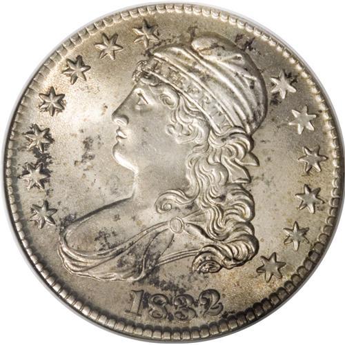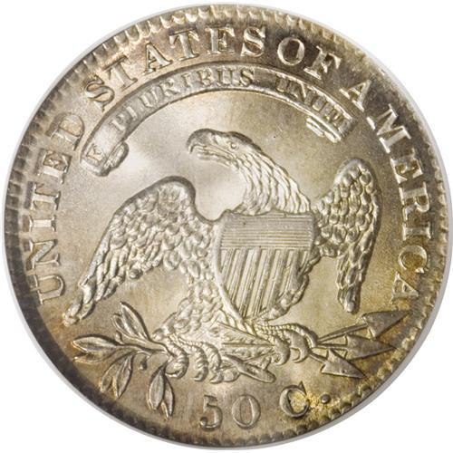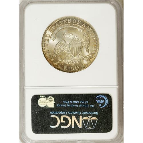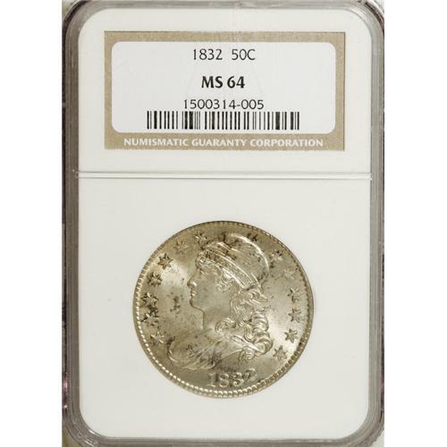 <B>1832 50C Small Letters MS64 NGC.</B></I> O-121, R.3. The flag of the top serif of the 1 in the date is recut, and the 2 has a broad, curved base. On the reverse a diagonal bar pierces stripes 5 and 6 in the shield. The upper shield is flatly struck, and the arrowheads are large and crude. The present specimen is a pleasing example of this variety, with much luster and daubs of light, dappled smoke-gray, copper, and magenta toning sprinkled hither and yon. Sharply struck for the variety, with moderate die erosion on each side.<BR><BR><b>Shipping:</b> Coins & Currency (<a target="_blank" href="http://www.heritageauctions.com/common/shipping.php">view shipping information</a>)