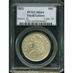 1832 50C Small Letters MS64 PCGS. O-102, R.1. The <B>1832 50C Small Letters MS64 PCGS.</B></I> O-102, R.1. The obverse is the better struck of the two sides, as usual for this variety, with golden-gray patina and a swath of blue-gray color on Liberty's cheek. There is a slender toning streak that extends across Liberty's neck, but no other distractions or problems seem evident on either of the two sides. <BR><BR><B>Important notice:</B> Heritage usually auctions material at the rate of 200-250 lots per hour. On some occasions eBay Live bid software or the Internet may not be able to keep up with the pace of the auction. We recommend placing a realistic absentee bid now as insurance to avoid disappointment. Occasionally the auctioneer may eliminate or reject an eBay Live bid, and the auctioneer may also reopen a lot after the close of the eBay live bidding (usually because we missed an audience bid), and may reject your bid even if it shows you as the winning bidder. By bidding via eBay Live, you agree that Heritage may award the lot to another bidder at its sole discretion under the circumstances described above or any other reasonable circumstances. Since eBay bids are not shown to us until we open the lot on the floor, we treat those bids just like floor bids. In most cases the floor responds before the eBay bid is presented to us, due to Internet lag time, so for consistency we have made it a policy that floor bids are always considered first over tie eBay live bids. Also please note that all Heritage lots purchased through eBay Live carry a 20% Buyer's Premium. Please make sure you read the Terms and Conditions before you bid. This lot is being auctioned in conjunction with a live floor auction by Heritage Galleries & Auctioneers. All final auction and invoice information will be supplied by Heritage Galleries & Auctioneers, and all other information should be considered preliminary. Lot:6079